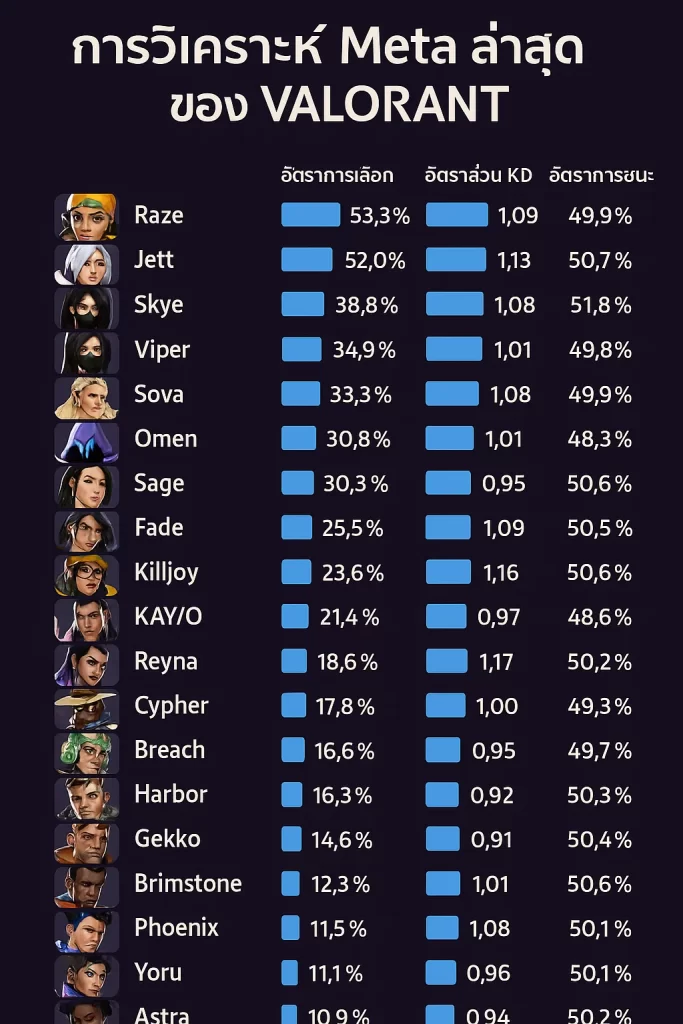 Meta ล่าสุดของ Valorant ชี้ชัดว่า ทีมที่สมดุลและใช้ Utility อย่างมีระบบ คือทีมที่มีโอกาสชนะสูงที่สุด Controller อย่าง Omen/Viper, Initiator อย่าง Sova/Fade, Sentinel อย่าง Killjoy และ Duelist ที่เลือกใช้ตามแมพ คือตัวเลือกที่ถูกต้องในเวลานี้
