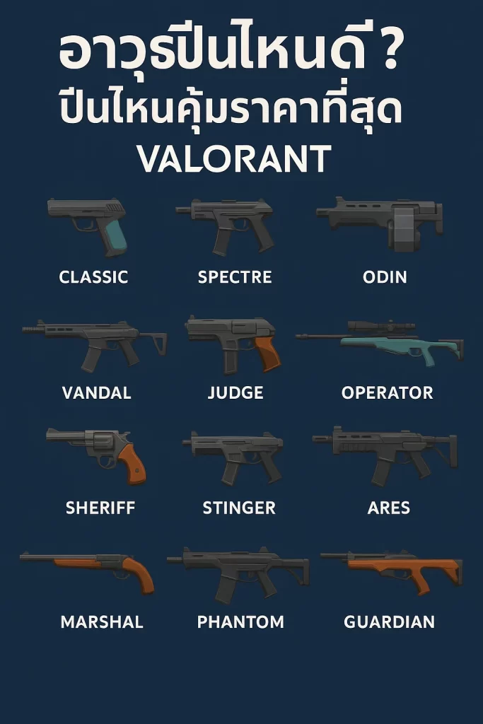 รีวิวอาวุธทุกชนิดใน Valorant หนึ่งในปัจจัยสำคัญที่ทำให้ Valorant แตกต่างจากเกมยิงปืนอื่น ๆ คือระบบเศรษฐกิจ (Economy System) ที่ผู้เล่นต้องบริหารเงินเพื่อเลือกซื้ออาวุธและ Utility ในแต่ละรอบอย่างเหมาะสม การเลือกปืนที่ “คุ้มค่า” ไม่ได้หมายถึงแค่ยิงแรง แต่ต้องพิจารณาราคา ความแม่น ระยะยิง และบทบาทของทีมด้วย
